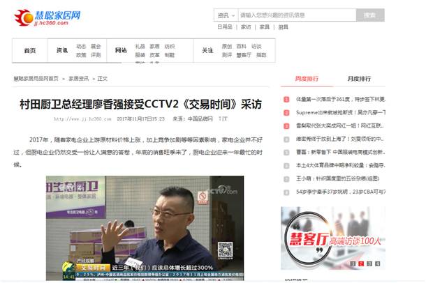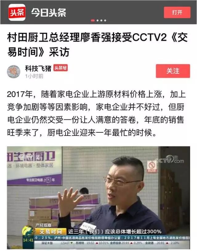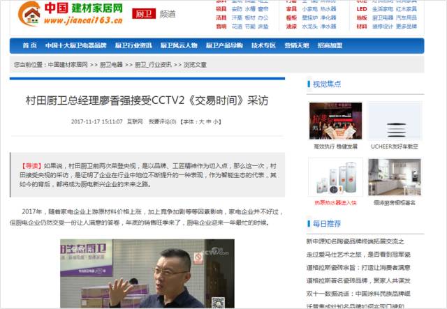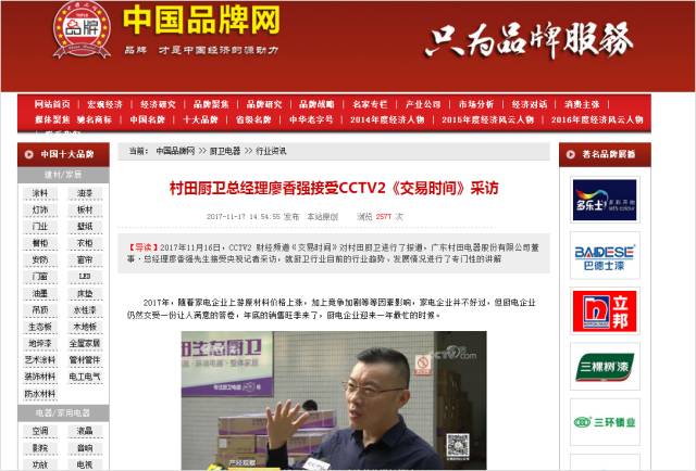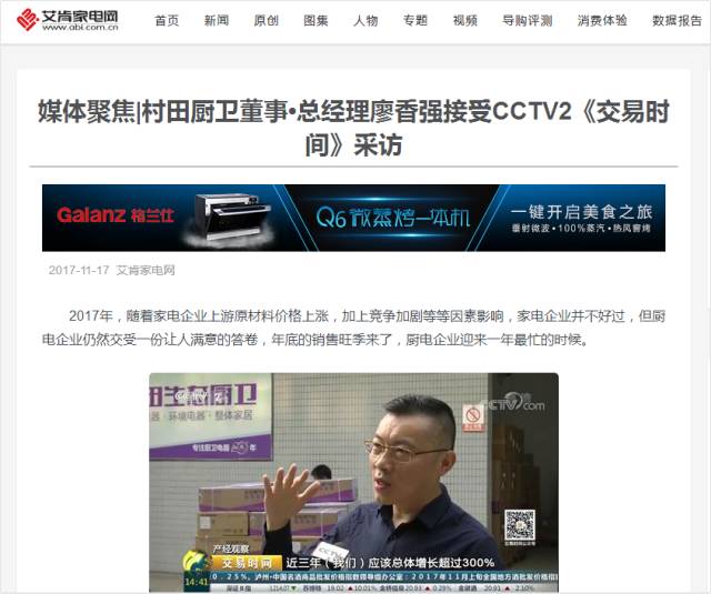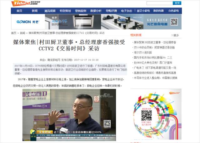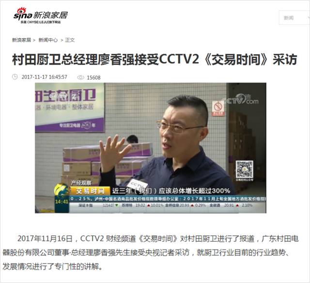 2017年11月16日,CCTV2财经频道《交易时间》、《整点财经》对官方版厨卫进行了报道,广东官方版电器股份有限公司董事·总经理廖香强先生接受央视记者采访,就厨卫行业目前的行业趋势、发展情况进行了专门性的讲解。