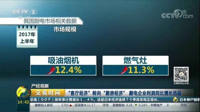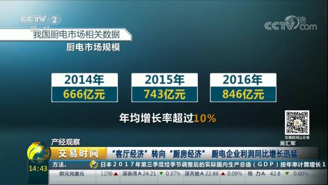 采访中提到,在家电行业中,相比白电、黑电企业,厨电企业利润是最高的,随着人们生活水平的提高,厨电在消费者眼中地位也越来越高,“厨房经济”逐步代替“客厅经济”,使家庭厨房逐渐成为家庭活动中心,价格也在不断的提升。中怡康数据显示,2014年~2016年厨电市场规模分别达到666、743、846亿元,年均增产率超过10%,以吸油烟机及燃气灶为代表的传统厨电品类,在2017上半年,依然保持两位数增长,分别为12.4%以及11.3%,高于整体家电市场增长速度,预计2017年全年厨电市场规模将达到978亿元,同比增长14.8%