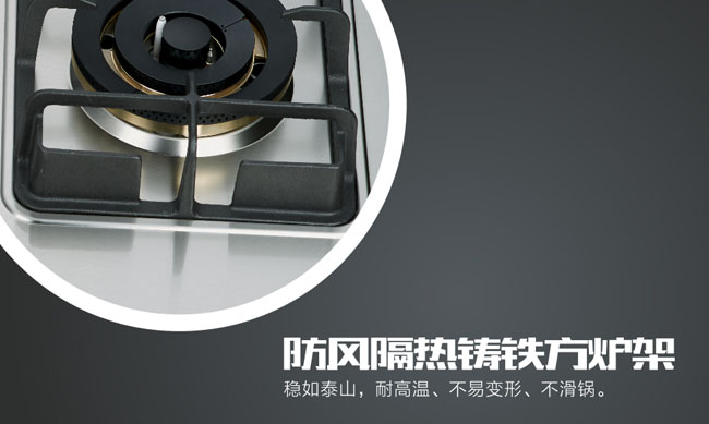 ◇ 防风隔热铸铁方炉架,时尚锌合金旋钮;