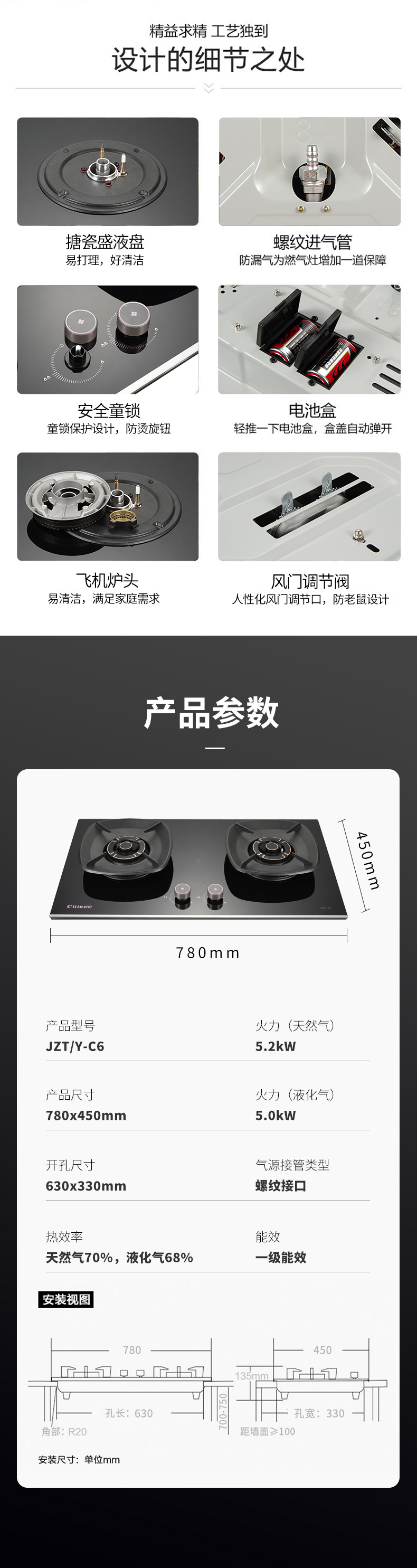 70%高效率+保洁炉头定时+低电量提醒零秒点火+宽频火火红点防烫提醒聚能方架+磨砂黑水盘