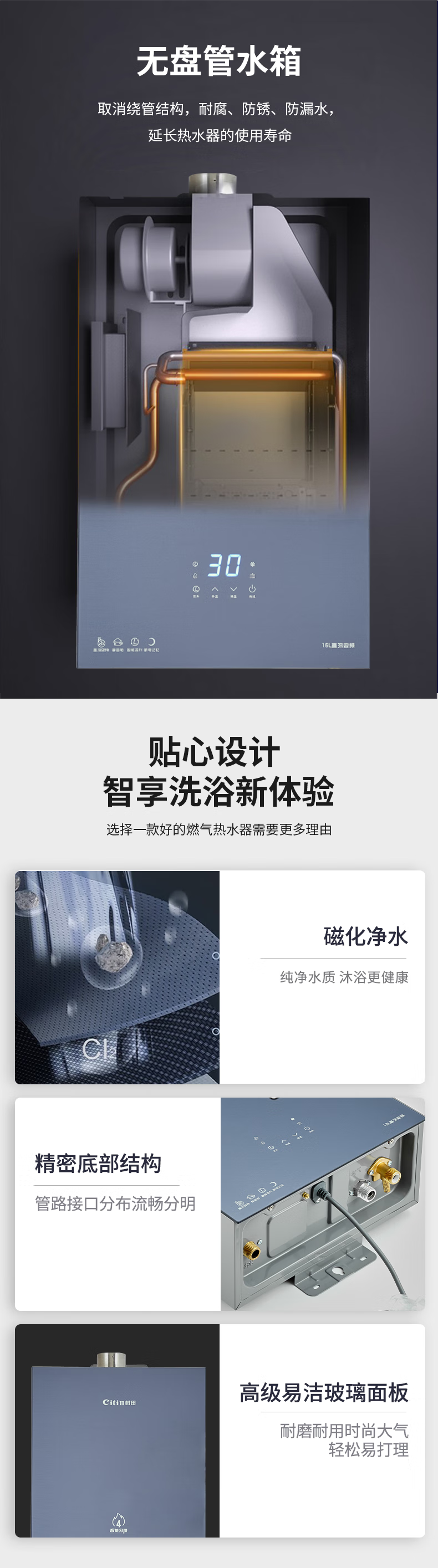 +直流恒温 +玻璃面板 +智变频 +智变升 +静音仓 +磁化水 +无盘管 +定时40min +4分段